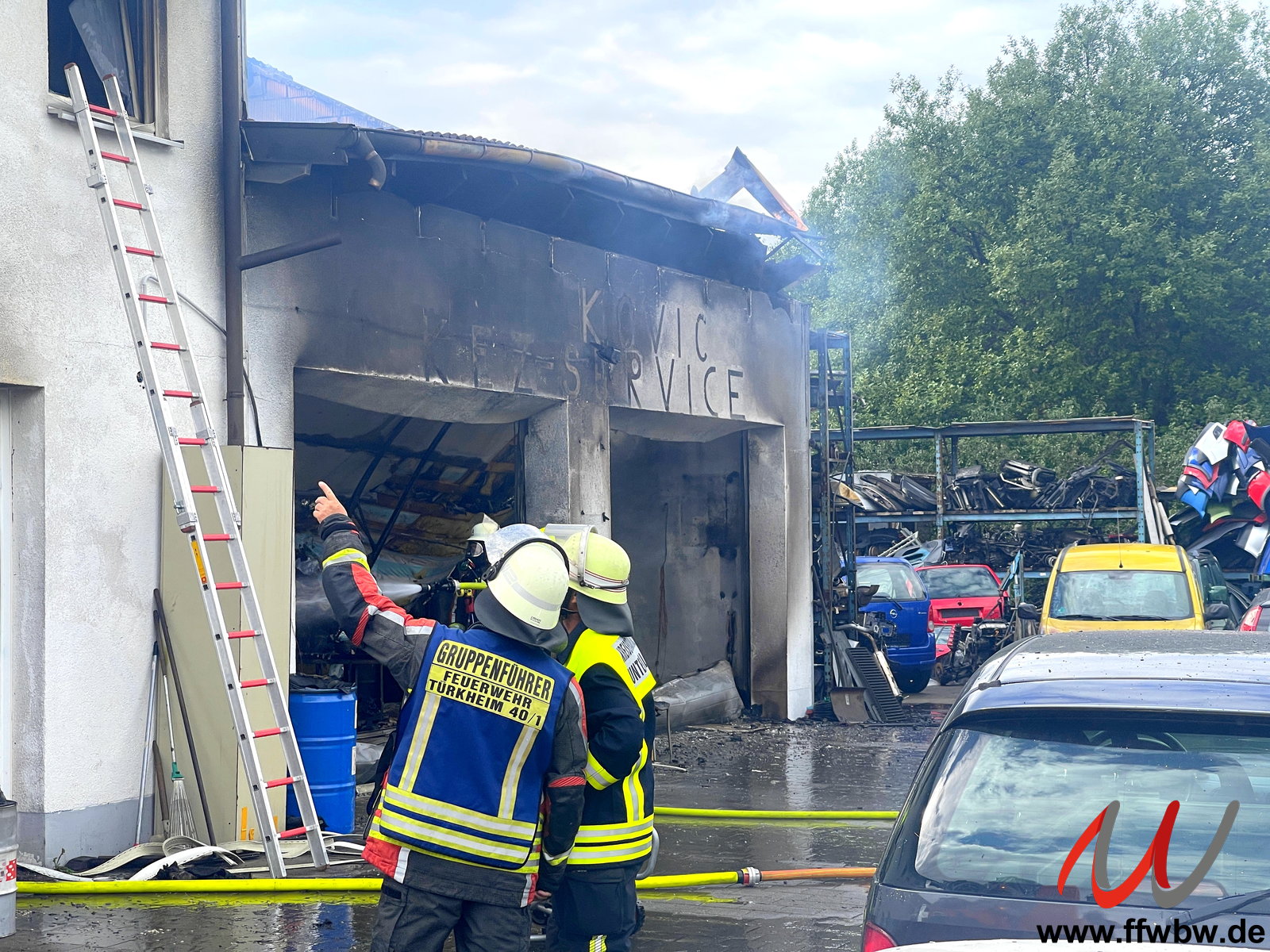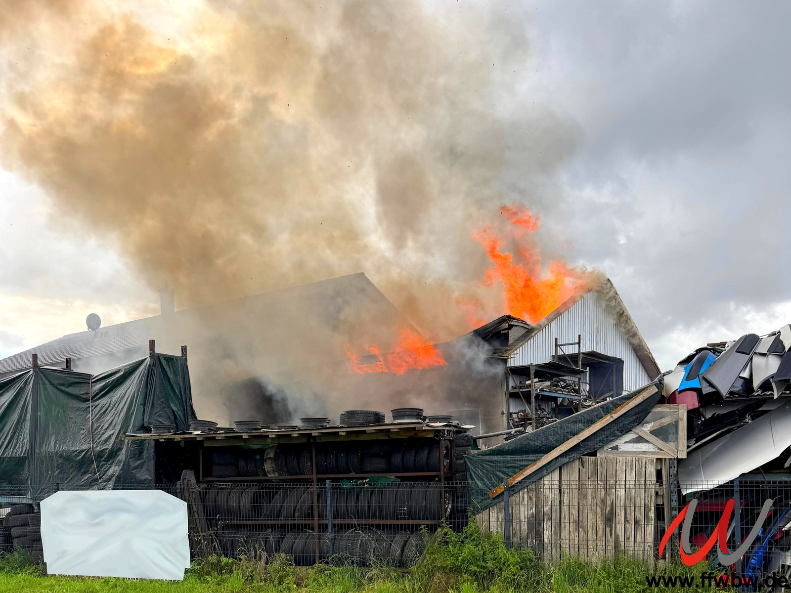 Bei Eintreffen der ersten Feuerwehren stand die Autowerkstatt in Vollbrand. Durch einen gezielten Außenangriff mit mehreren Rohren konnte ein Übergreifen des Feuers auf das Wohn- und Geschäftshaus verhindert werden.
