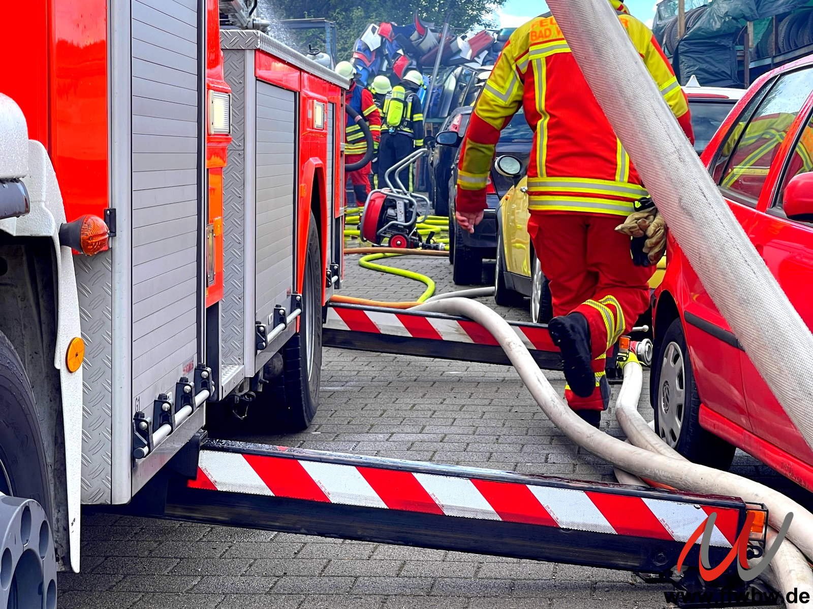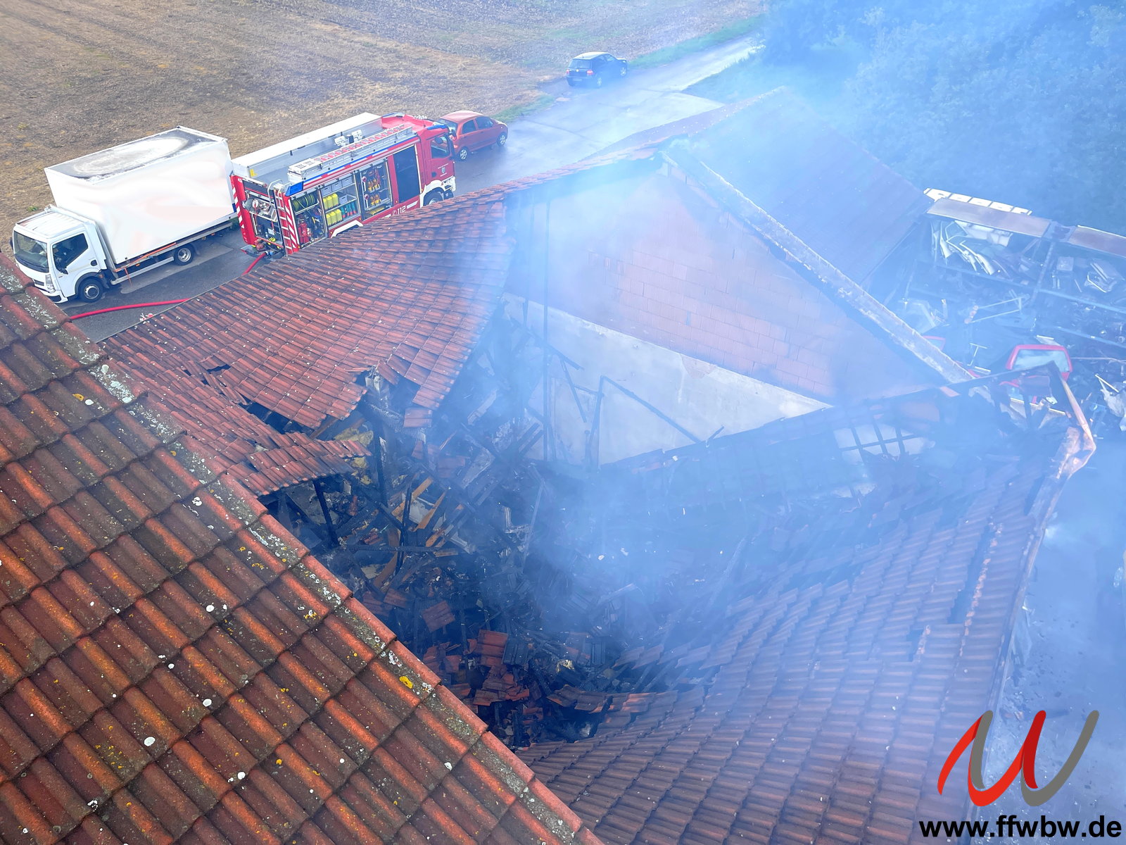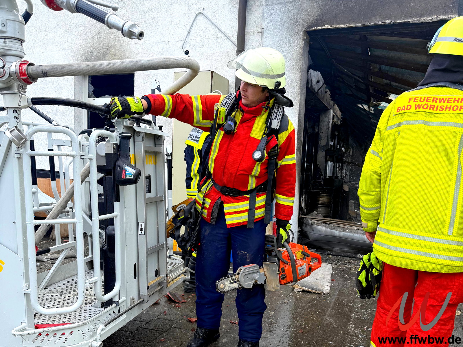 Die Löscharbeiten wurden auch mit einem Rohr über den Rettungskorb der Drehleiter unterstützt. Personen kamen bei dem Feuer glücklicherweise nicht zu Schaden.