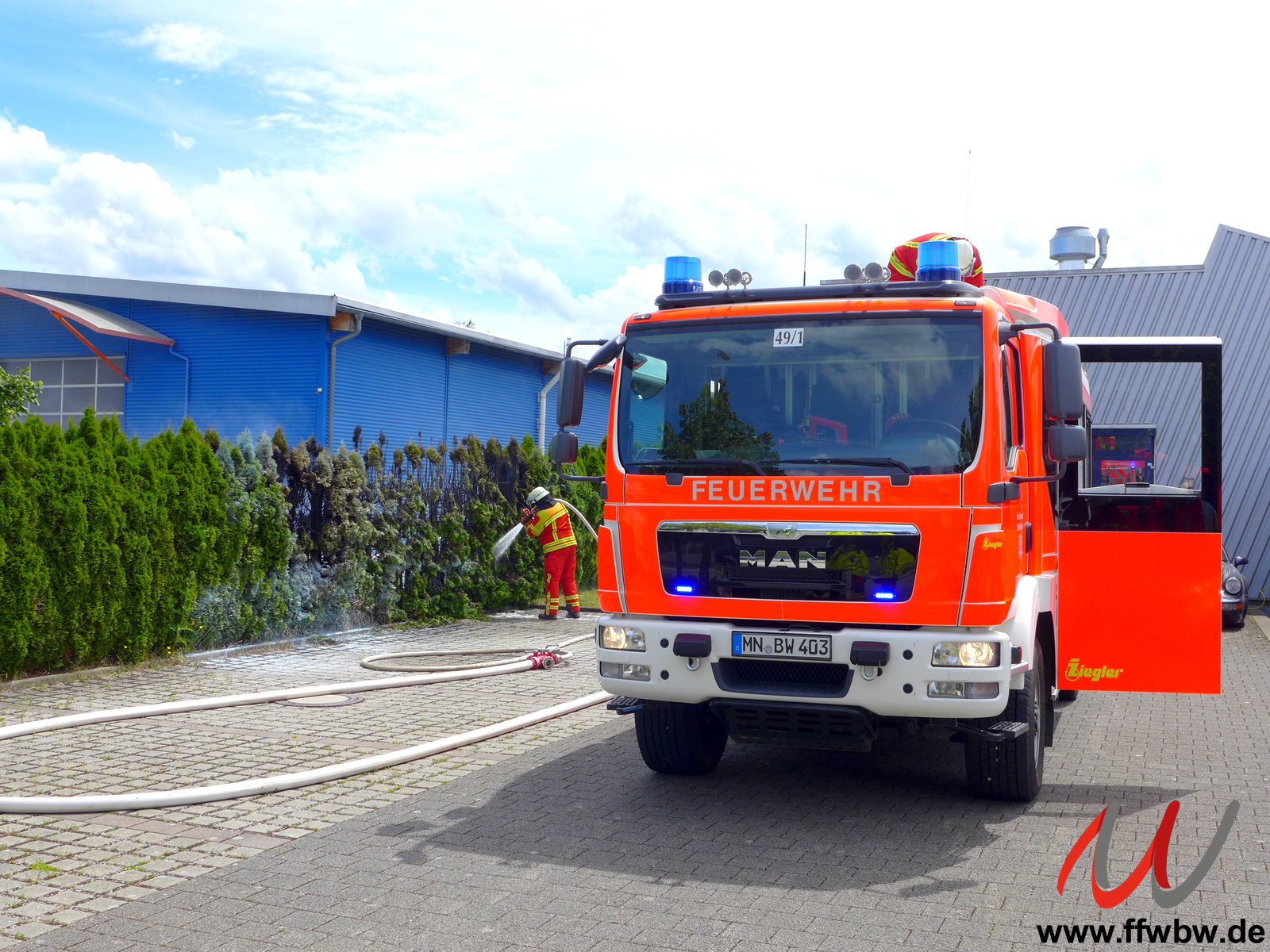 Alarmierung der Feuerwehr Bad Wörishofen zu einem Heckenbrand in die Messerschmittstraße. Von Anwohnern wurde bereits angefangen mit einem Gartenschlauch zu löschen. Die Feuerwehr führte die Brandbekämpfung mit einem C-Rohr weiter und kontrollierte im Anschluss den Bereich noch auf Glutnester.