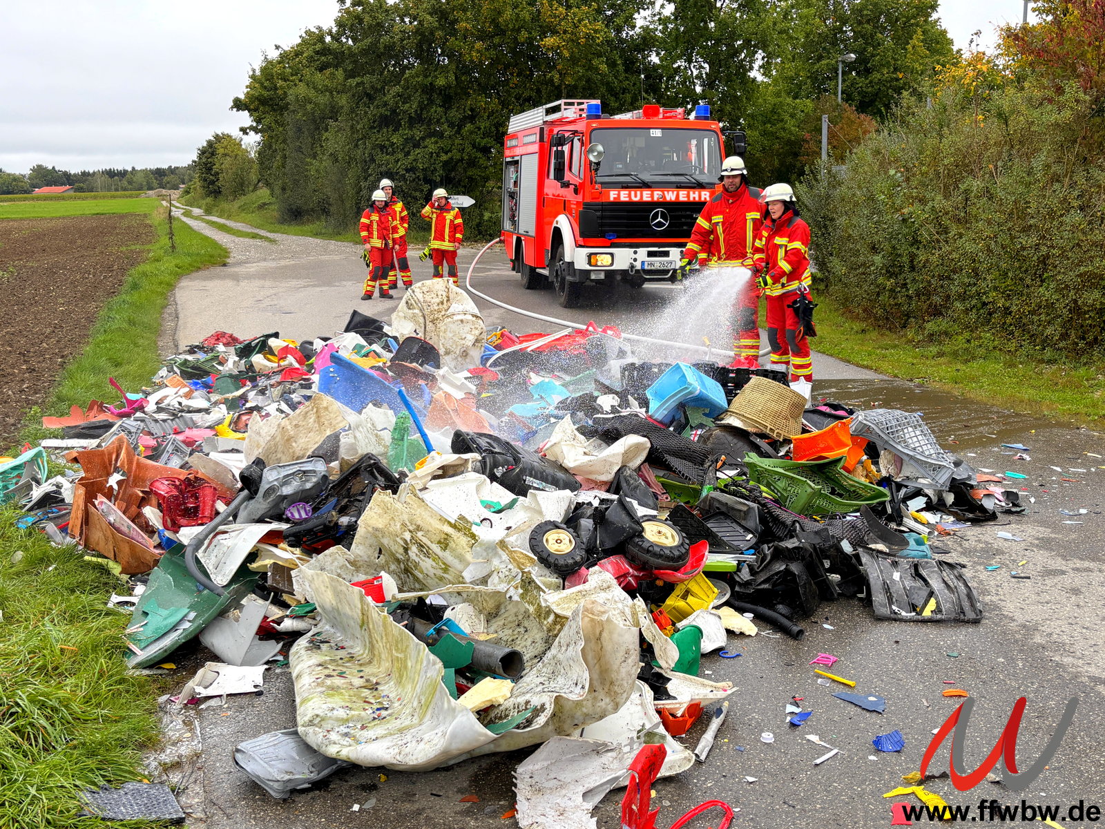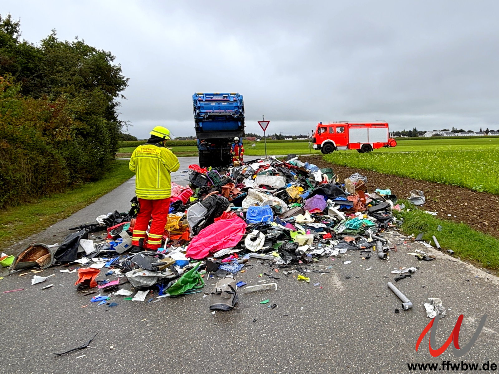Nach den Löscharbeiten konnte der abgekippte Inhalt mit Hilfe eines Radladers des Betriebshofes wieder in Müllwagen verladen und die Straße gereinigt werden.