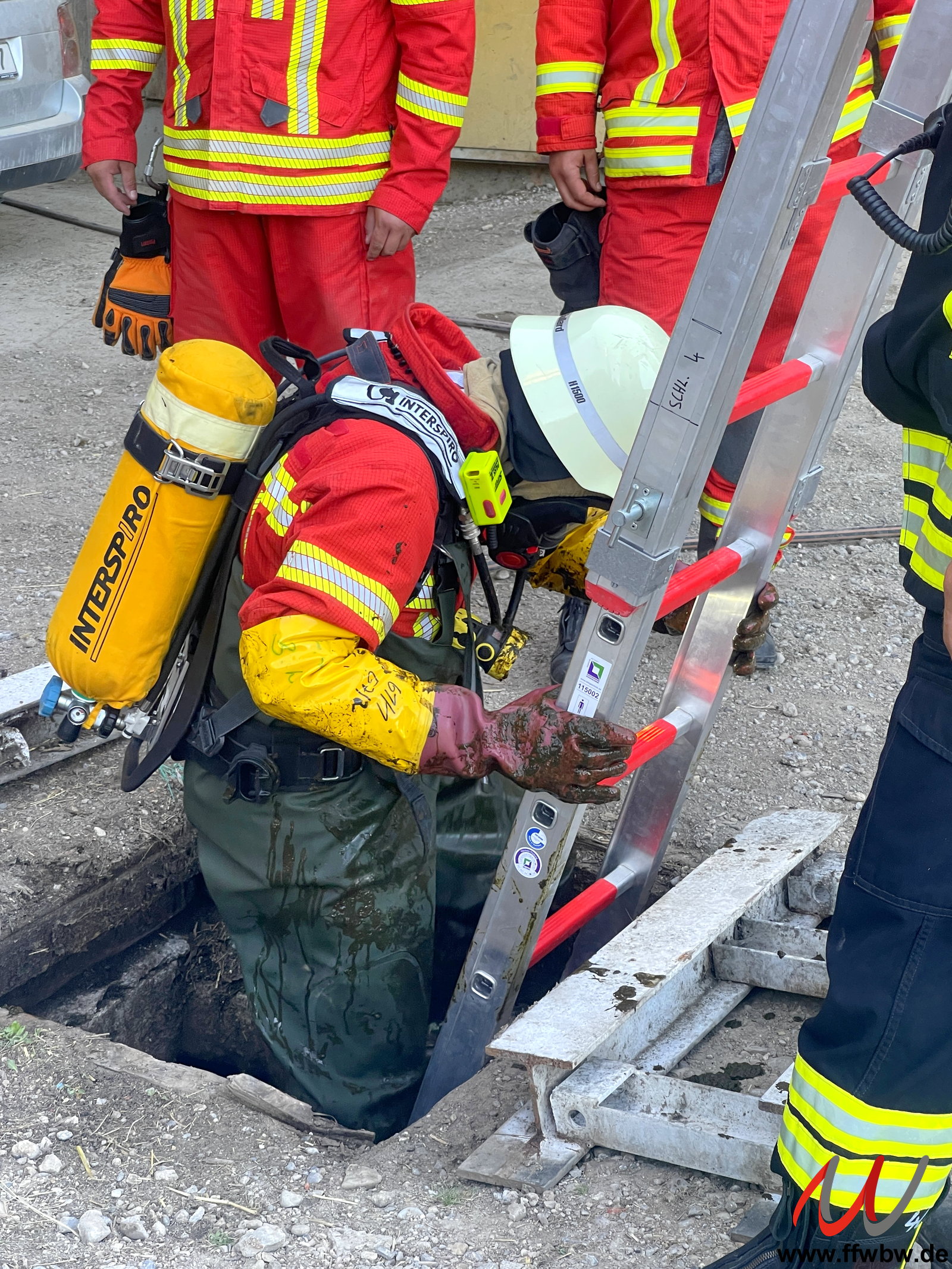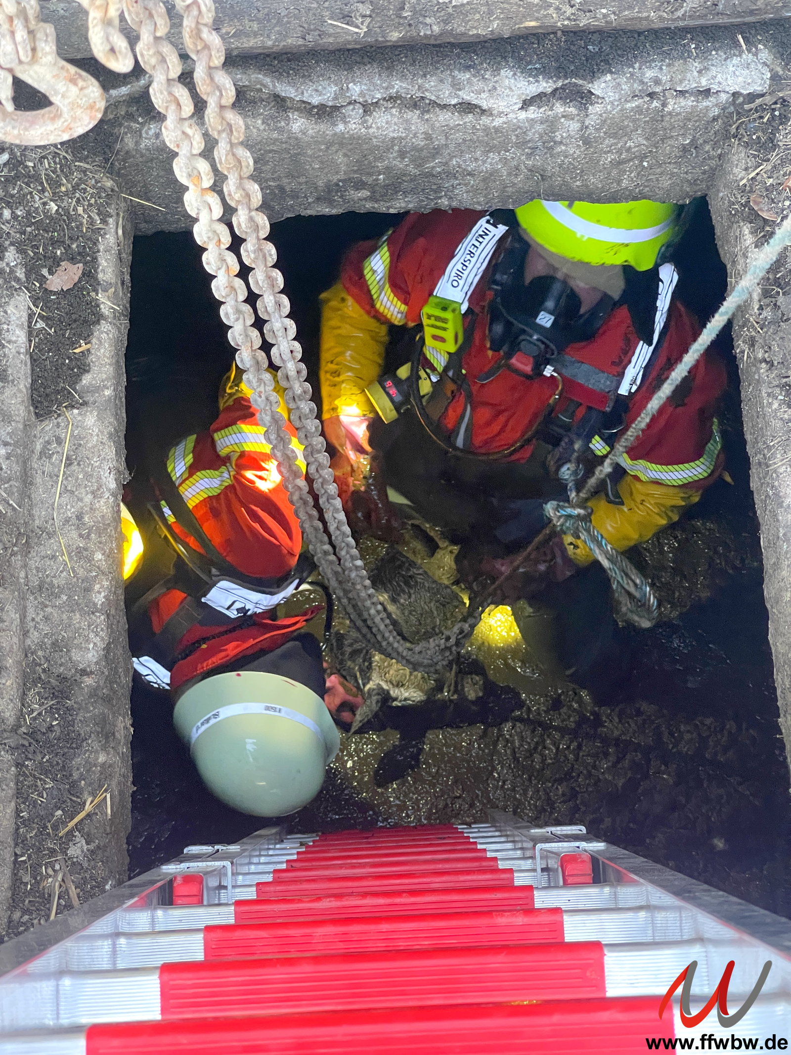 Über einen engen Schacht verschaffte sich ein Atemschutztrupp der Feuerwehr Schlingen Zugang zur Grube. Mit Hebebändern konnte das Kalb durch den Atemschutztrupp in der Grube auf die Rettung vorbereitet werden.