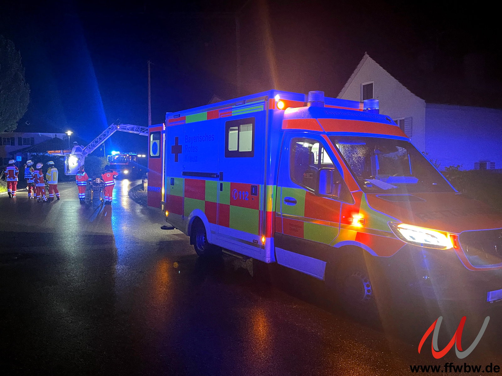 Alarmierung zu einer Personenrettung mit der Drehleiter in die Türkheimer Straße nach Ettringen. Ein Patient musste aufgrund seines Krankheitsbildes liegend aus dem ersten Obergeschoss nach unten befördert werden. Ein liegender Transport durch das Treppenhaus war aufgrund der baulichen Situation nicht möglich.