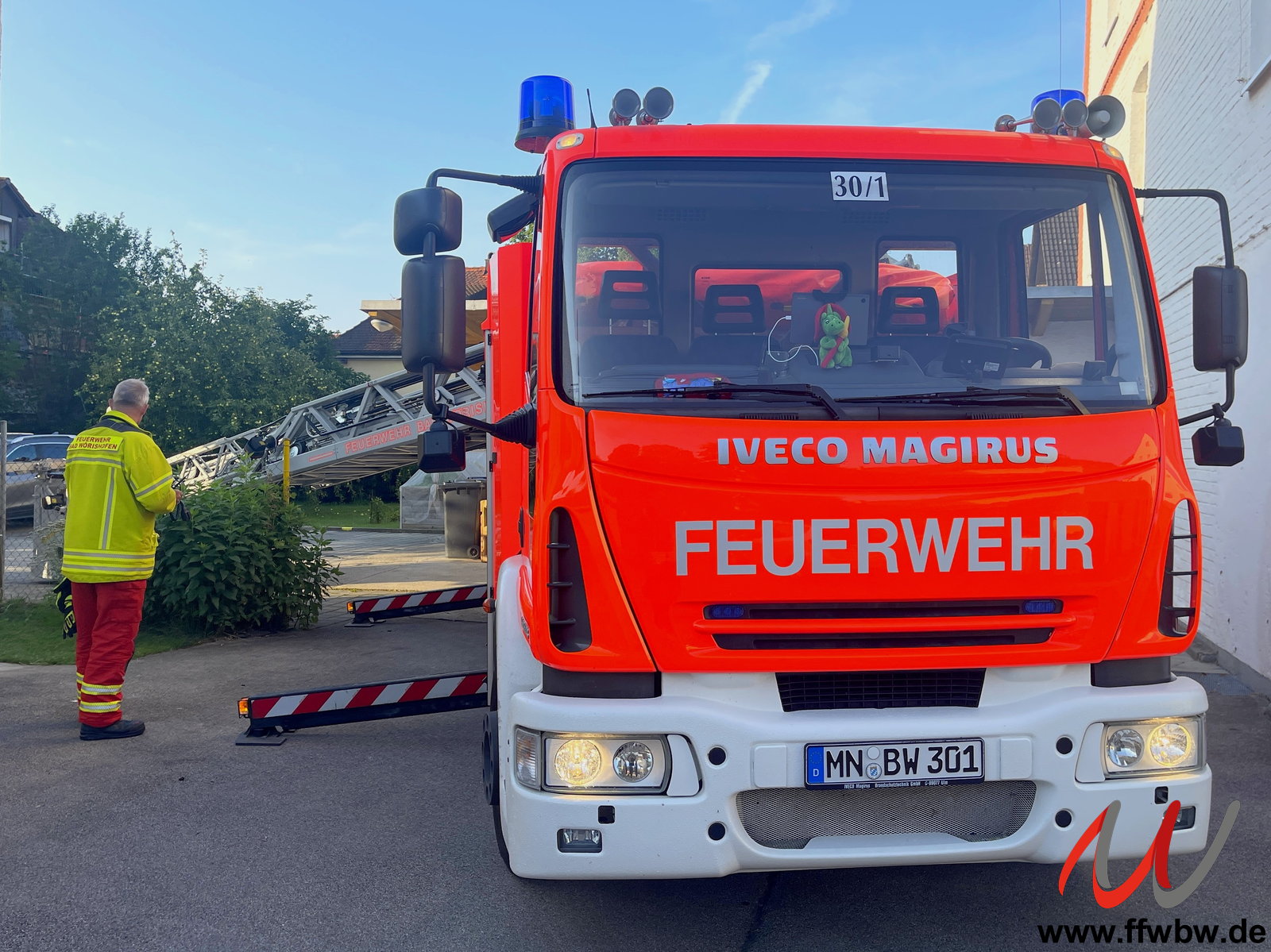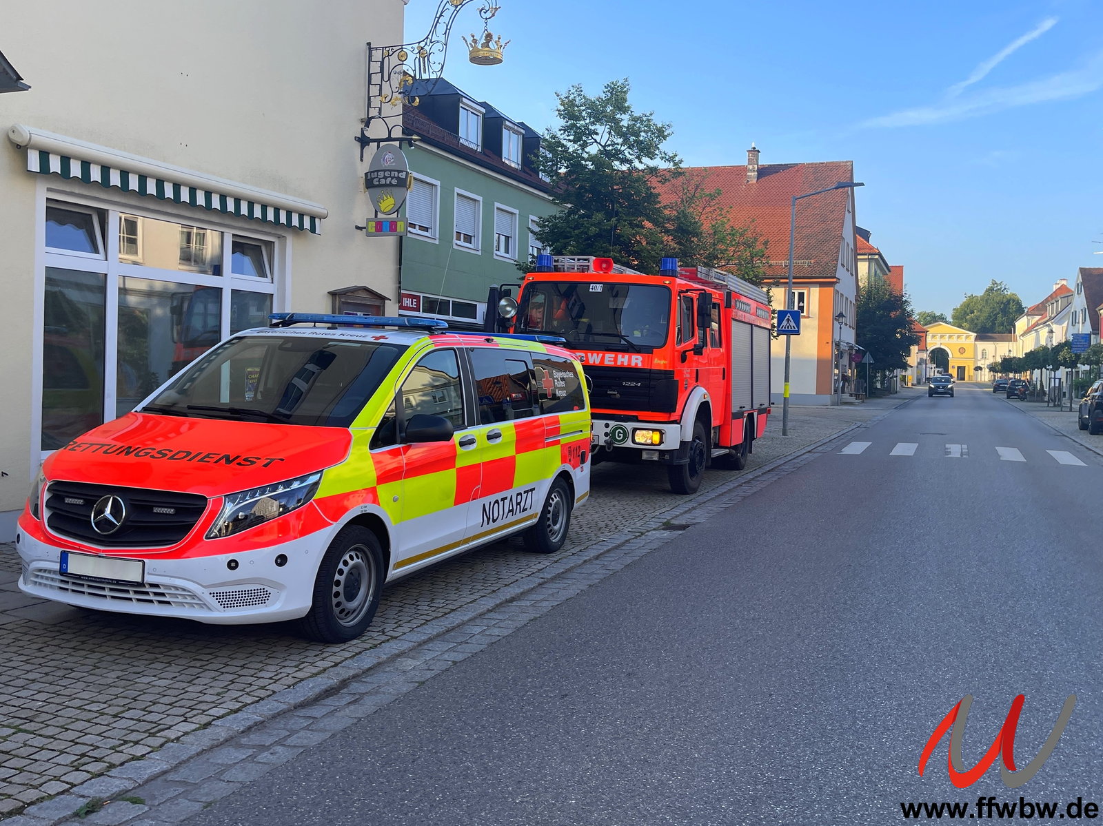 Alarmierung zu einer Personenrettung mit der Drehleiter in die Maximilian-Philipp-Straße nach Türkheim. Ein Patient musste aufgrund seines Krankheitsbildes liegend aus dem zweiten Obergeschoss nach unten befördert werden. Ein liegender Transport durch das Treppenhaus war aufgrund der baulichen Situation nicht möglich.