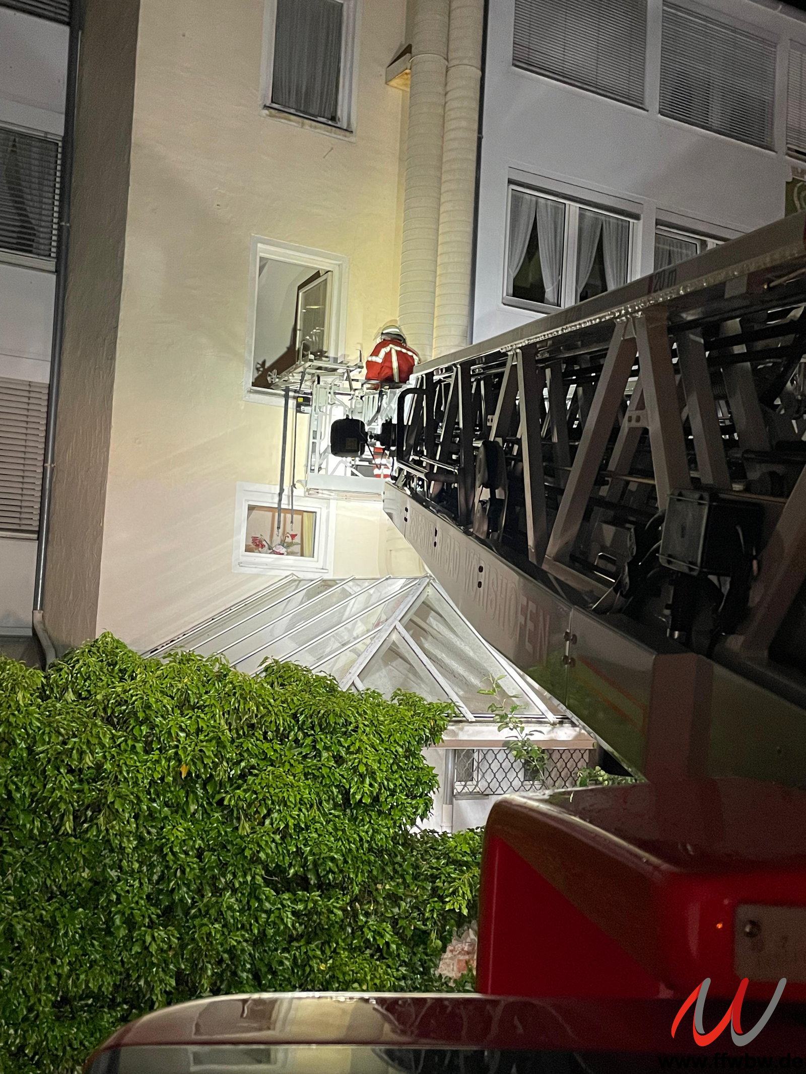 Alarmierung zu einer Personenrettung mit der Drehleiter in die Kneippstraße. Ein Patient musste aufgrund seines Krankheitsbildes liegend aus dem zweiten Obergeschoss nach unten befördert werden. Ein liegender Transport durch das Treppenhaus war aufgrund der baulichen Situation nicht möglich.
