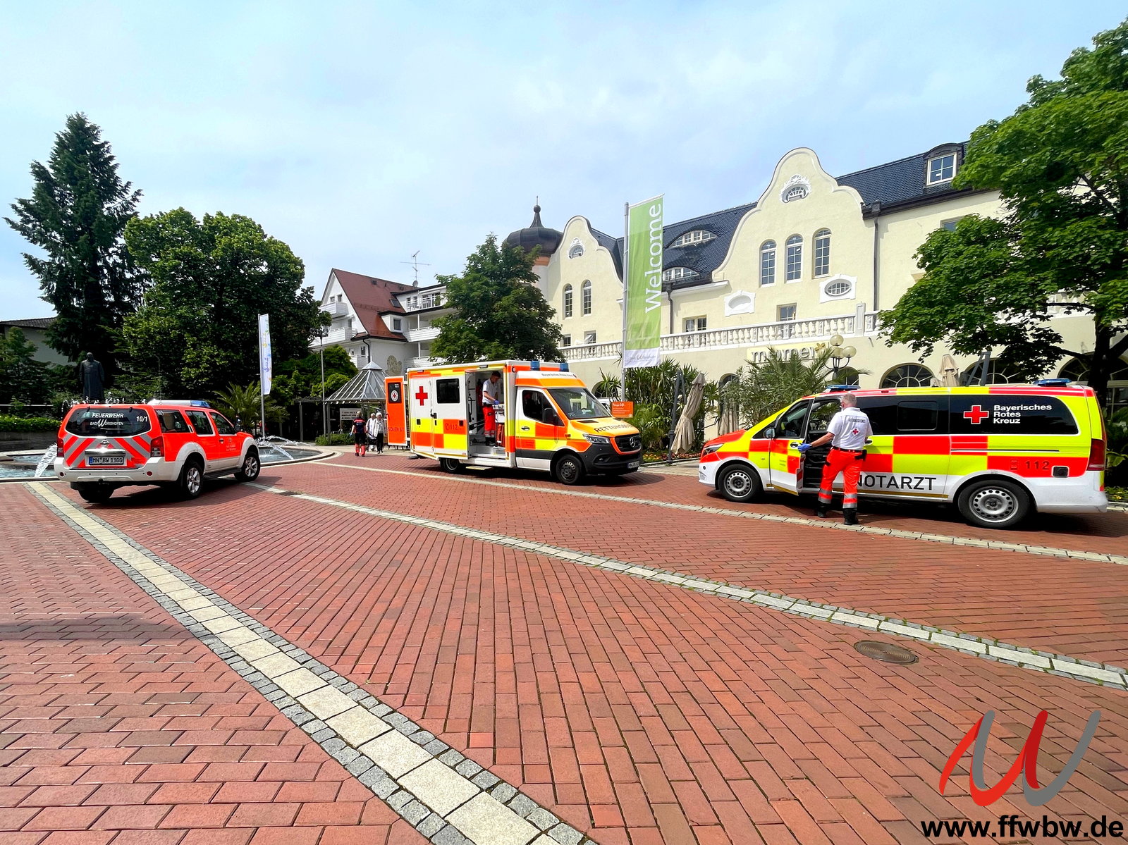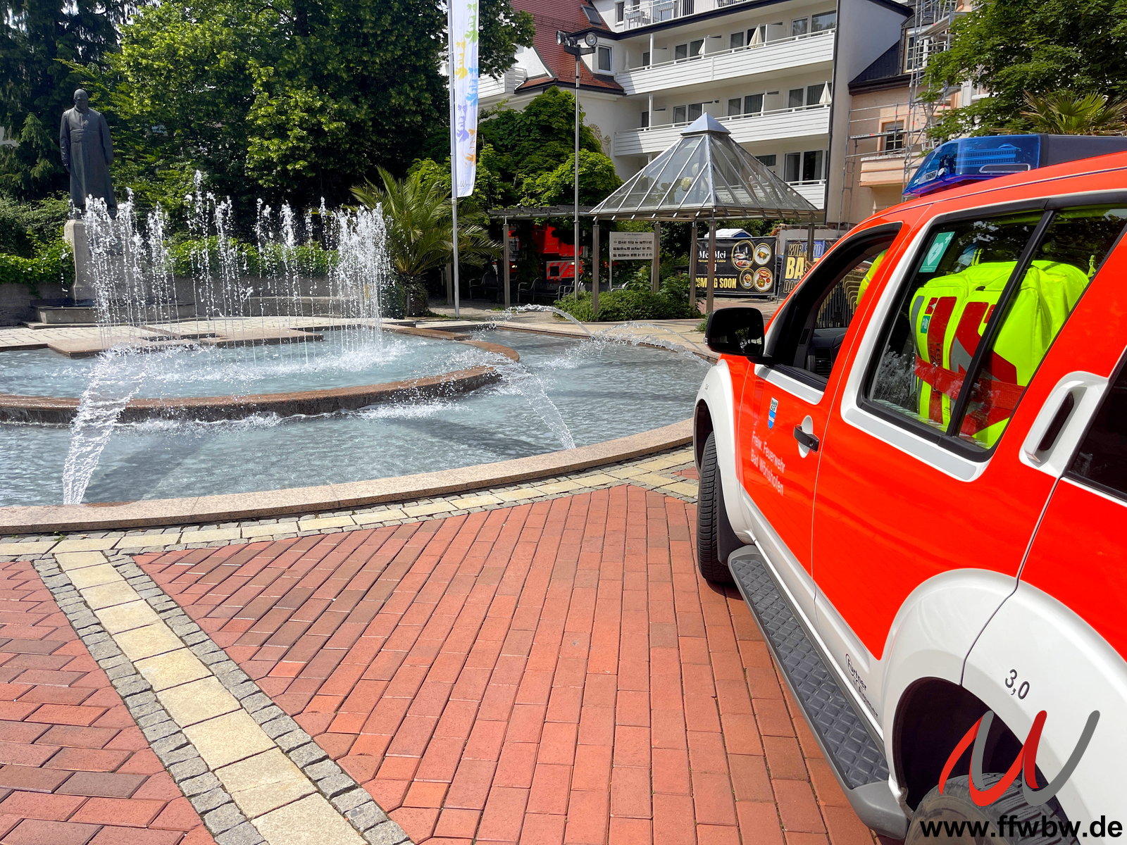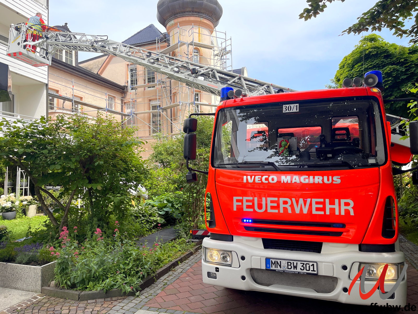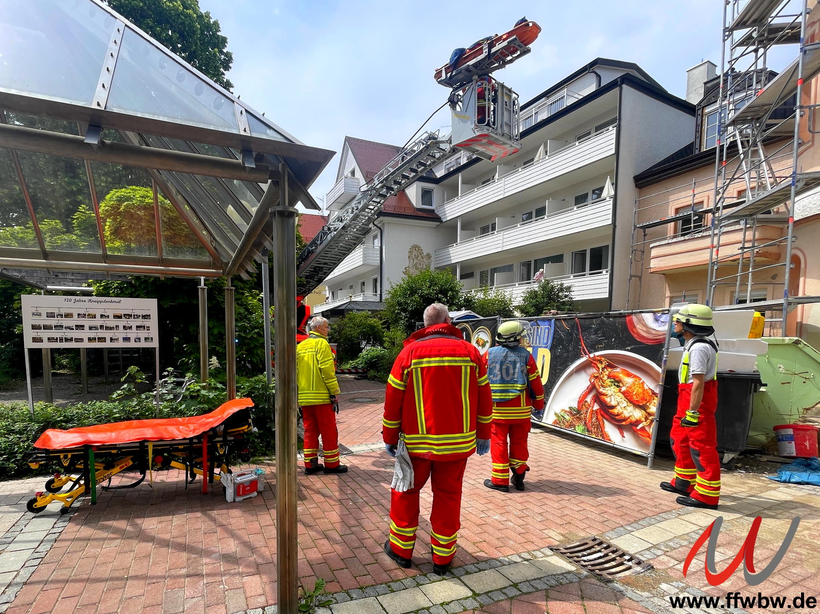 Alarmierung zu einer Personenrettung mit der Drehleiter an den Denkmalplatz. Ein Patient musste aufgrund seines Krankheitsbildes liegend aus dem ersten Obergeschoss nach unten befördert werden. Ein liegender Transport durch das Treppenhaus war aufgrund der baulichen Situation nicht möglich.