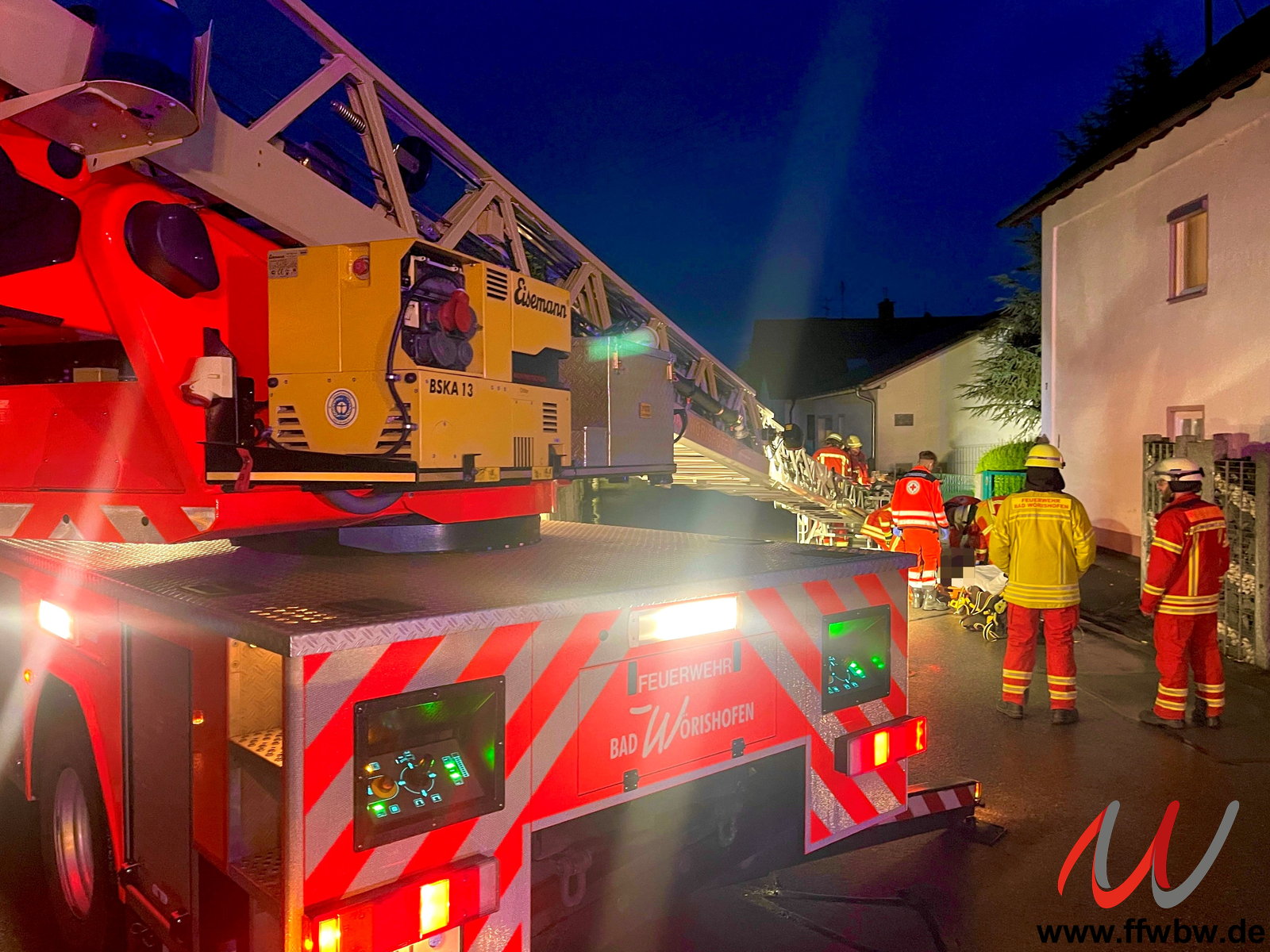 Alarmierung zu einer Personenrettung mit der Drehleiter in die Sternstraße nach Türkheim. Ein Patient musste aufgrund seines Krankheitsbildes liegend aus dem ersten Obergeschoss nach unten befördert werden. Ein liegender Transport durch das Treppenhaus war aufgrund der baulichen Situation nicht möglich.