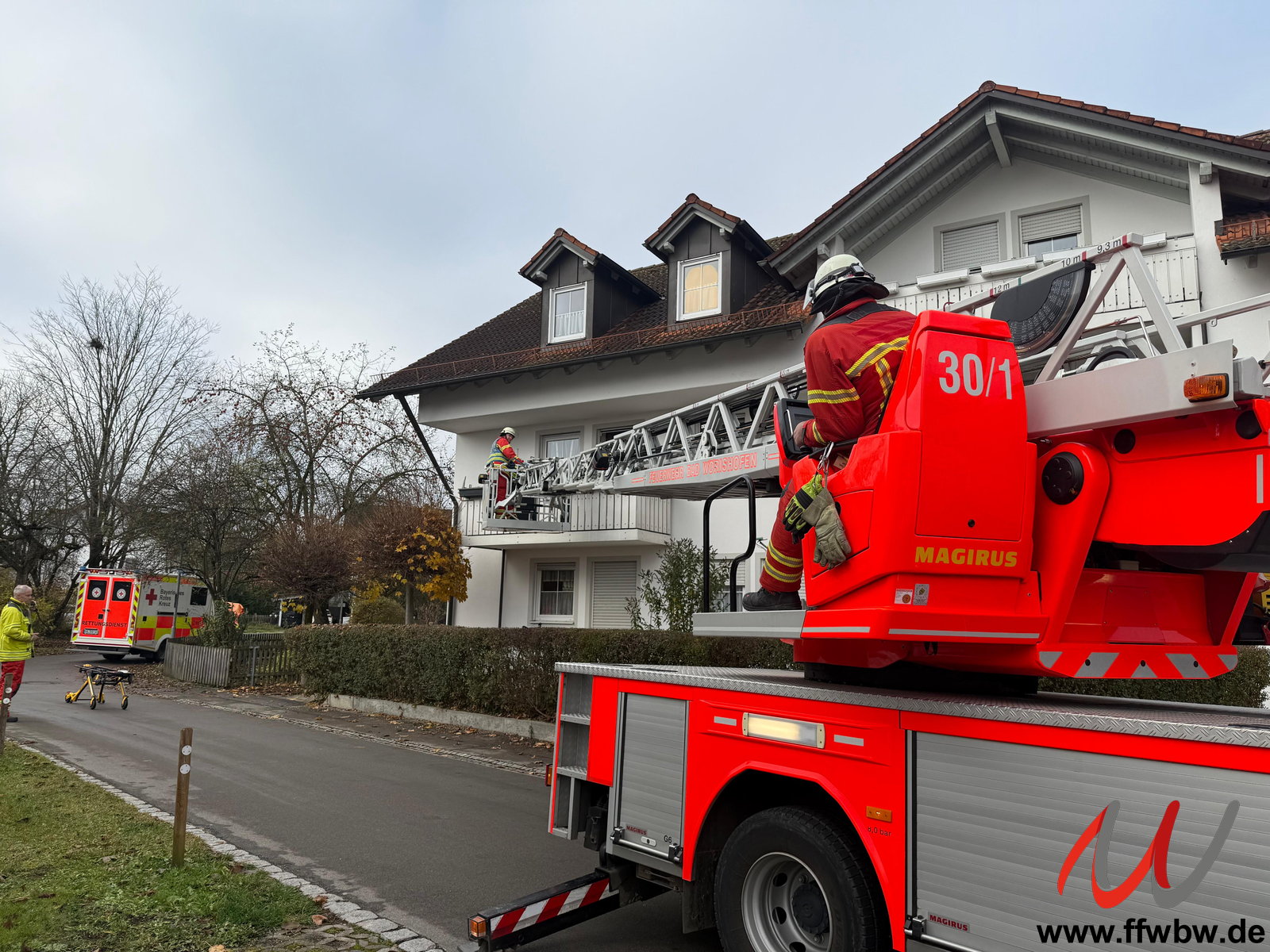 Alarmierung zu einer Personenrettung mit der Drehleiter nach Kirchdorf am Kirchanger. Ein Patient musste aufgrund seines Krankheitsbildes liegend aus dem ersten Obergeschoss nach unten befördert werden. Ein liegender Transport durch das Treppenhaus war aufgrund der baulichen Situation nicht möglich.