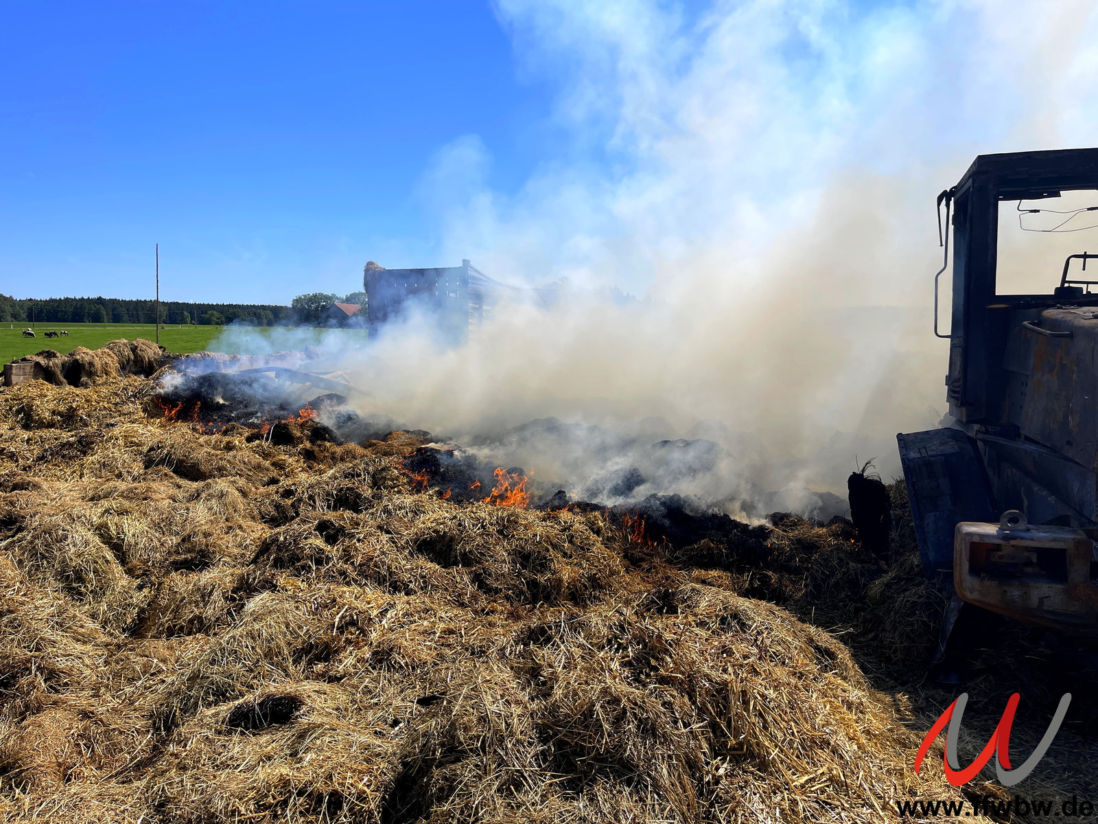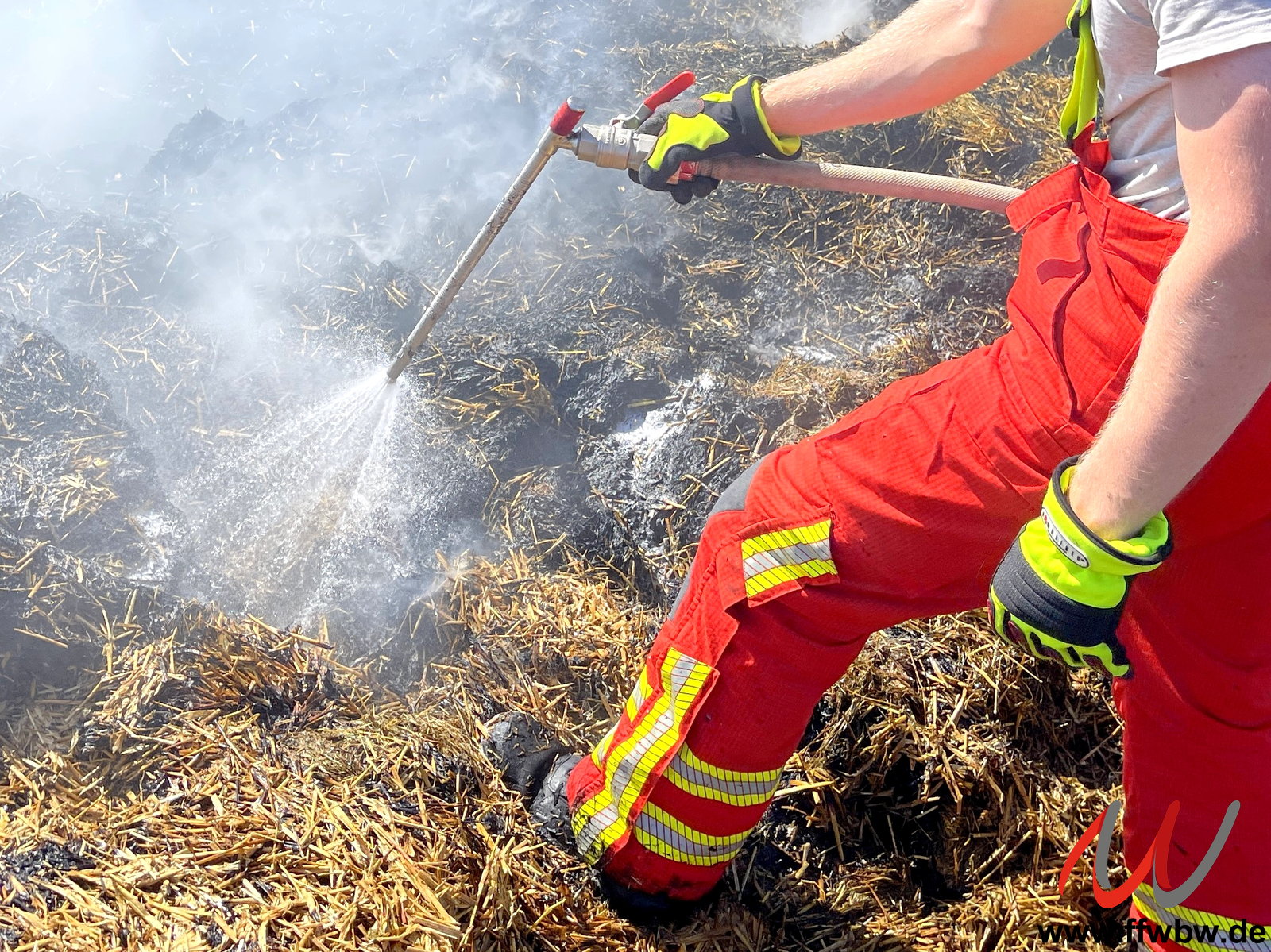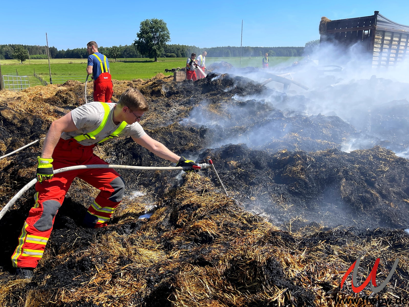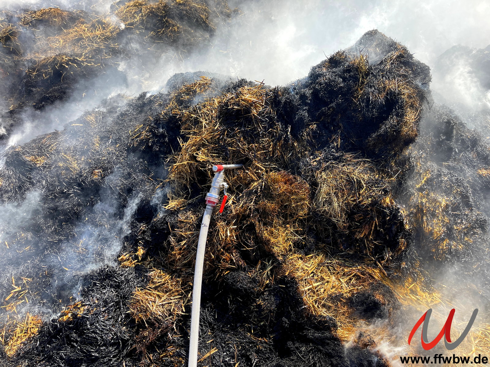 Erneute Alarmierung der Feuerwehr Bad Wörishofen nach Untergammenried zur vorherigen Einsatzstelle. Das auf einer Wiese neben dem Brandobjekt ausgebreitete Stroh fing an mehreren Stellen wieder an zu qualmen. Zum Einsatz kamen zum gezielten Ablöschen der Glutnester auch mehrere Fognail-Lanzen.