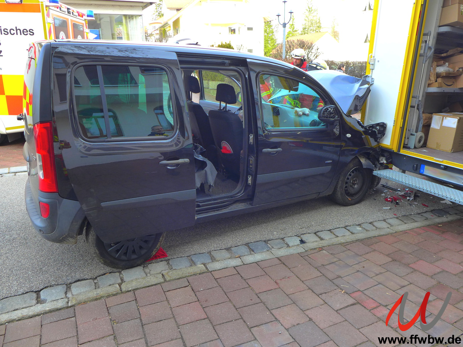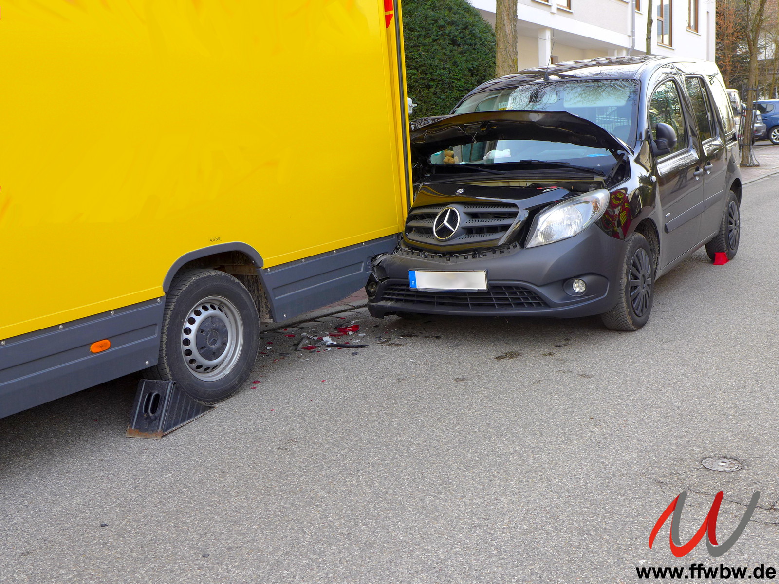 Alarmierung zu einem Verkehrsunfall in der Hermann-Aust-Straße. Ein mit einer Person besetzter Pkw prallte aus bislang nicht bekannter Ursache in das Heck eines am Straßenrand parkenden Kastenwagen eines Paketzustellerdienstes. Die verletzte Person des Pkw wurde bis zum Eintreffen von Rettungsdienst und Notarzt durch Einsatzkräfte der Feuerwehr medizinisch versorgt. Gleichzeitig erfolgte die Sicherung der beiden Fahrzeuge auf der abschüssigen Straße gegen Wegrollen. Die verletzte Person wurde im Verlauf in eine Klinik transportiert. Während der Rettungsarbeiten und Unfallaufnahme der Polizei war die Hermann-Aust-Straße durch die Feuerwehr komplett für den Verkehr gesperrt.