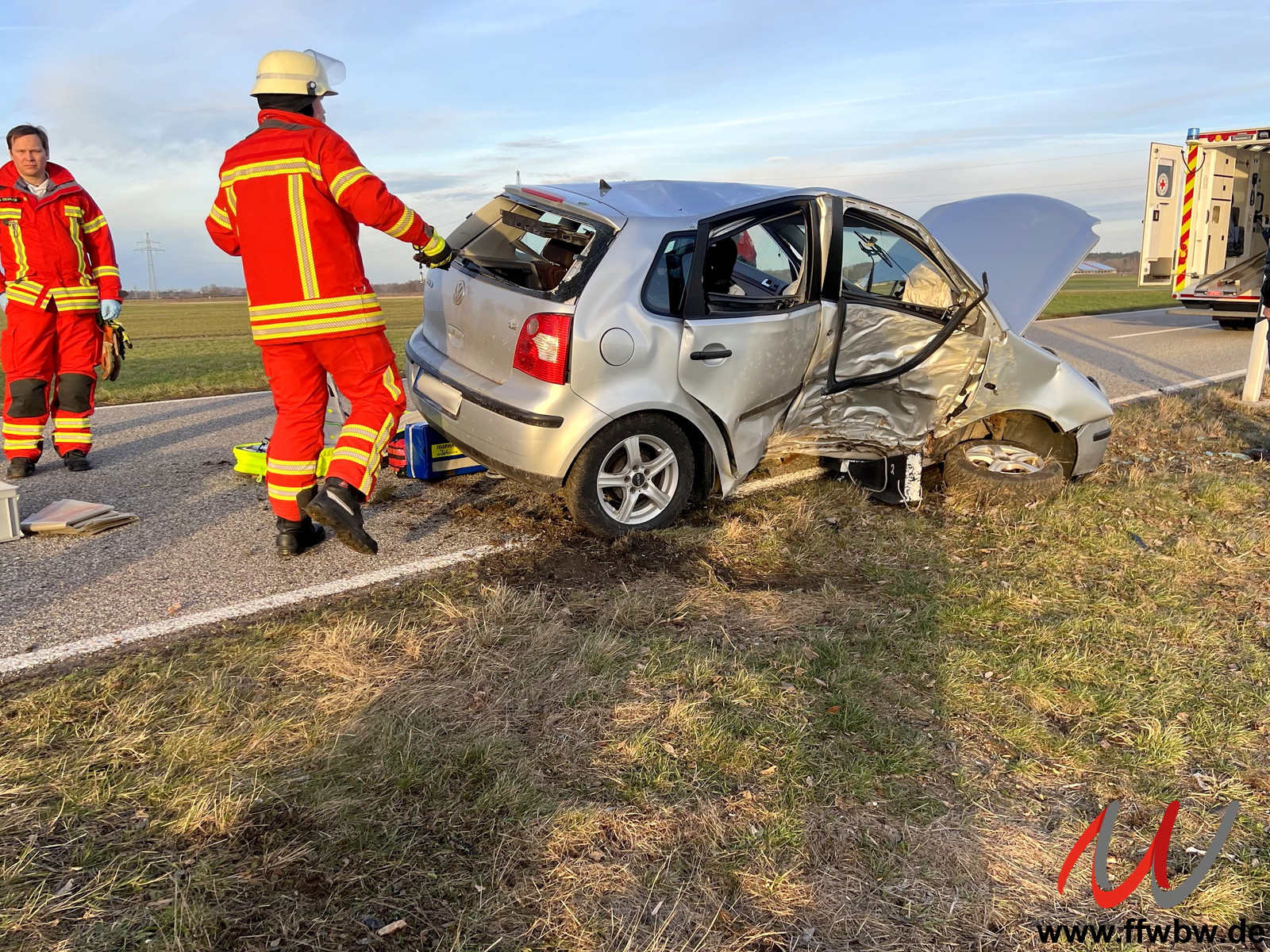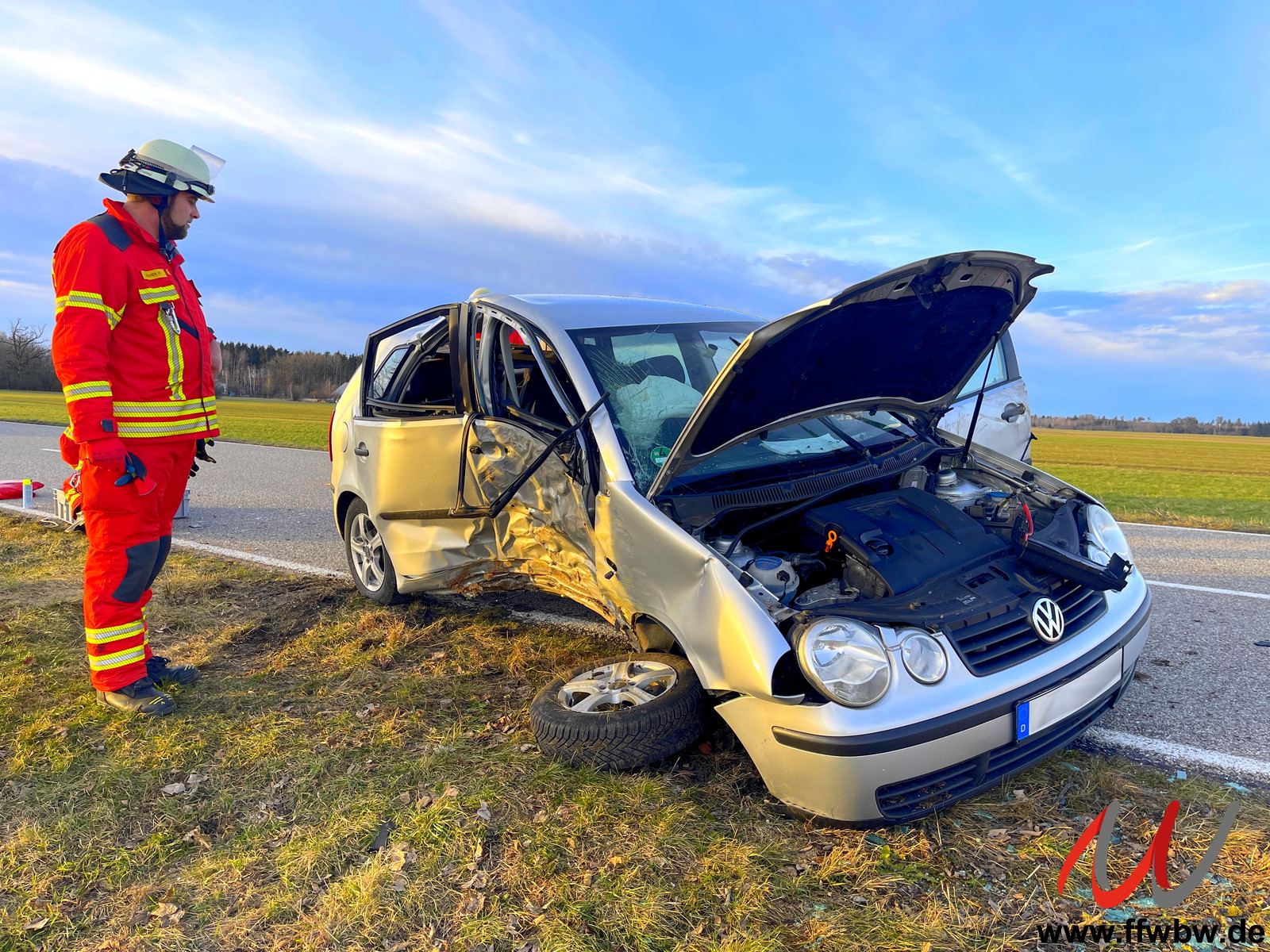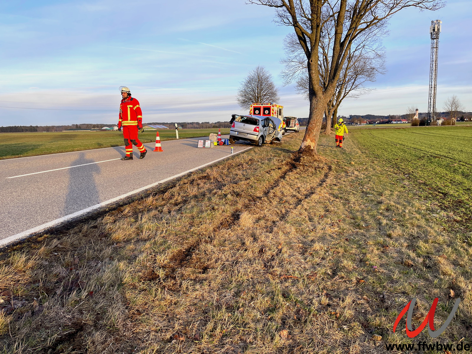 Alarmierung zu einem Verkehrsunfall zwischen Bad Wörishofen und Stockheim. Aus bislang ungeklärter Ursache prallte ein mit einer Person besetzter Pkw alleinbeteiligt mit der Beifahrerseite gegen einen Baum. Die verletzte Person wurde bis zum Eintreffen des Rettungsdienstes von der Feuerwehr erstversorgt. Der Verkehr wurde einspurig an der Unfallstelle vorbei geleitet. Die Polizei Bad Wörishofen hat die Ermittlungen zur genauen Unfallursache aufgenommen.