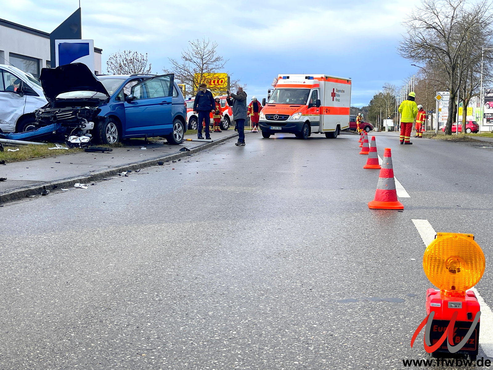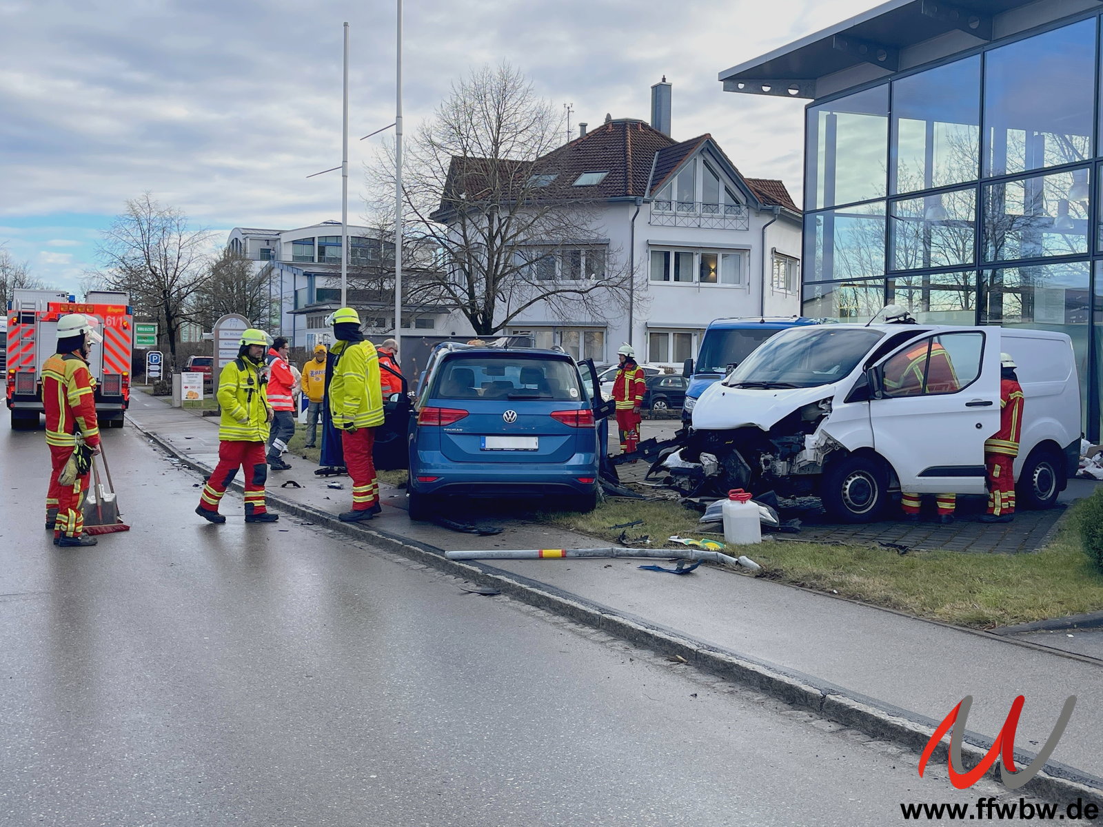 Alarmierung der Feuerwehr Bad Wörishofen zu einem Verkehrsunfall in der Rudolf-Diesel-Straße. Offenbar wegen gesundheitlicher Probleme kam ein PKW-Fahrer von der Straße ab, überfuhr einen Fußweg und kollidierte im Anschluss daran mit zwei in einer Parkbucht stehenden Pkw.
