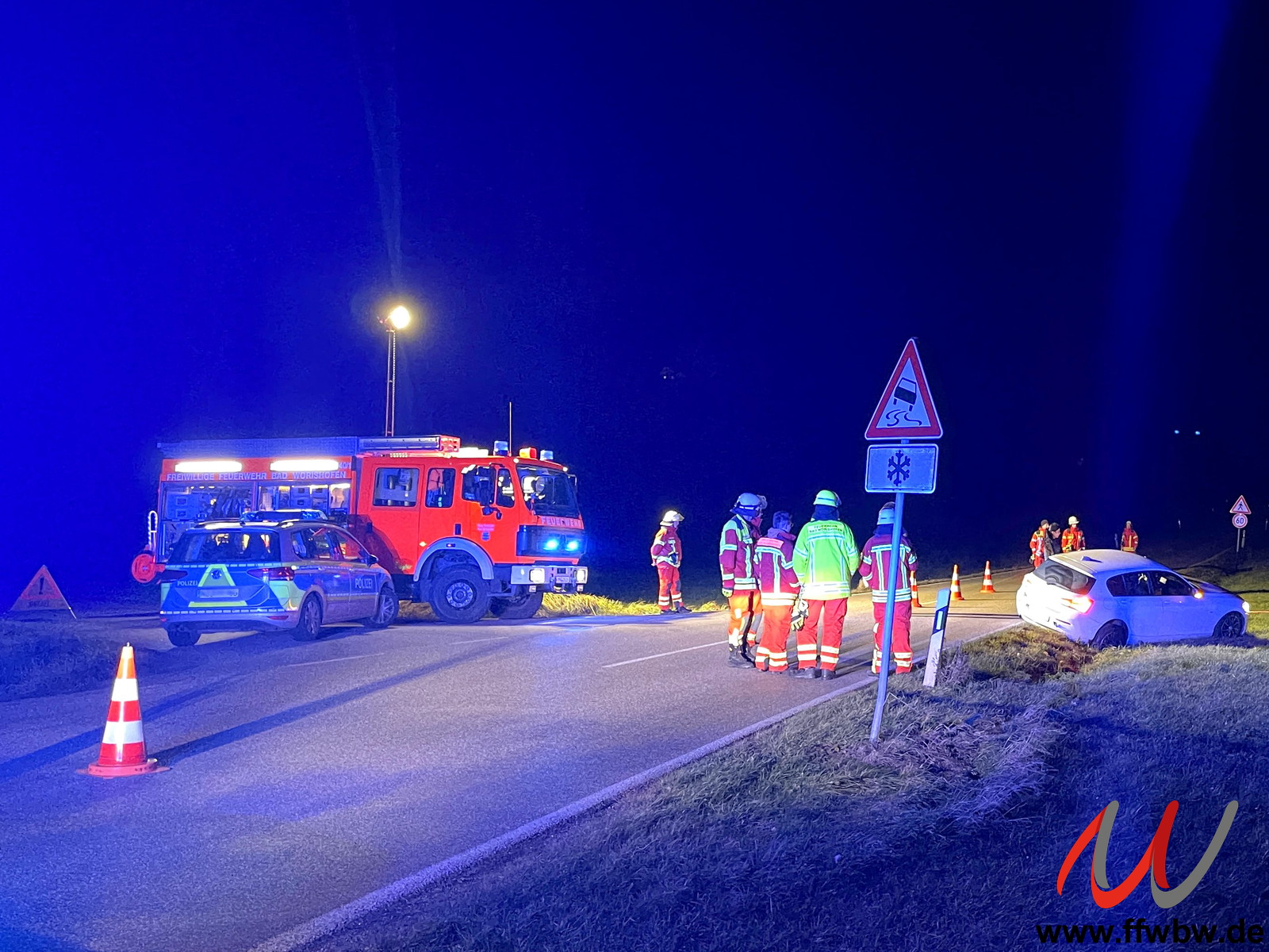 Ein mit einer Person besetzter Pkw kam aus bislang unbekannter Ursache von der Fahrbahn ab und rutschte dabei in einen kleinen Böschungsgraben. Die Person wurde dabei leicht verletzt und bis zum Eintreffen des Rettungsdienstes von Einsatzkräften der Feuerwehr medizinisch erstversorgt und betreut.