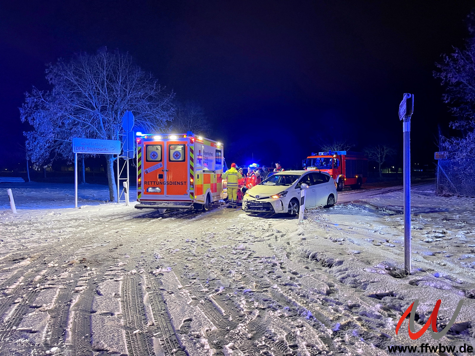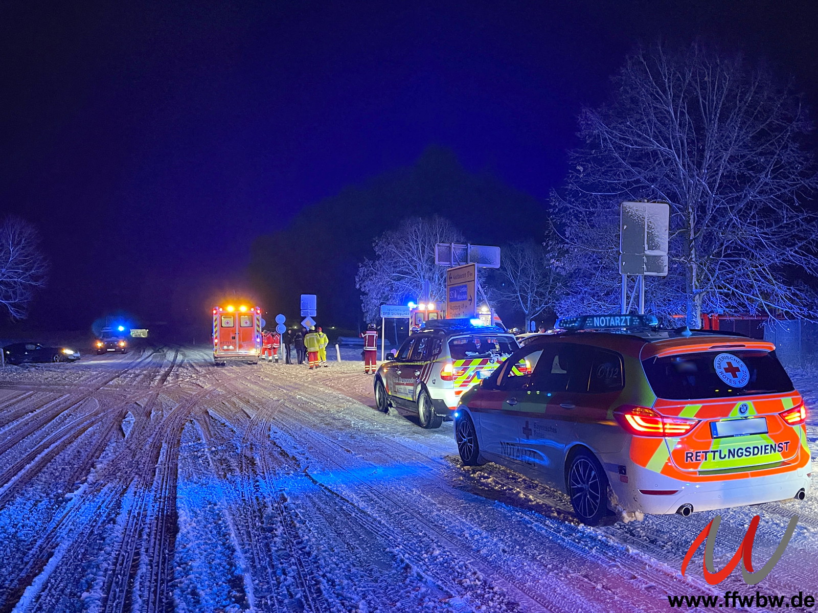 Alarmierung der Feuerwehr Bad Wörishofen zu einem Verkehrsunfall an der Kreuzung Staatsstraße 2015 – Abzweigung Stadionring. Dort kollidierten aus bislang ungeklärter Ursache zwei Pkw auf schneebedeckter Fahrbahn.